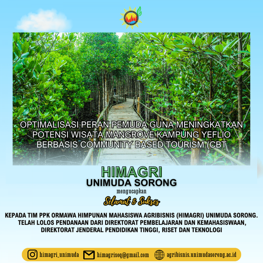 Tahun ini, Himpunan Mahasiswa Agribisnis lolos dengan mengajukan judul proposal ”Optimalisasi Peran Pemuda Guna Meningkatkan Potensi Wisata Mangrove Kampung Yeflio Berbasis Community Based Tourism”. Program ini nantinya Tim HIMAGRI akan melaksanakan program pengoptimalan produktivitas pemuda kampung Yeflio dalam upaya pengembangan desa wisata hutan mangrove. Kampung Yeflio memiliki potensi wisata mangrove yang sangat menjanjikan. Wisatawan dapat menikmati keindahan hutan mangrove, melihat satwa liar seperti burung serta menikmati kuliner khas yang tersedia di kampung Yeflio.